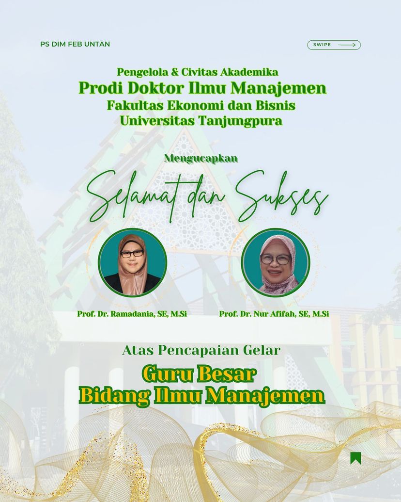 Ketua Program Studi Doktor Ilmu Manajemen Fakultas Ekonomi dan Bisnis Universitas Tanjungpura (FEB Untan) beserta seluruh civitas akademika dengan sukacita mengucapkan selamat dan sukses kepada dua sosok luar biasa, yaitu Prof. Dr. Ramadhania, SE, M.Si dan Prof. Dr. Nur Afifah, M.Si, atas capaian gemilang sebagai Guru Besar Bidang Ilmu Manajemen.